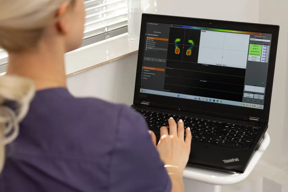 Пацієнт змикає зуби на тонкому цифровому сенсорі T-Scan. Система фіксує, які зуби стискаються першими, з якою силою та наскільки рівномірно розподіляється навантаження між правою та лівою сторонами.